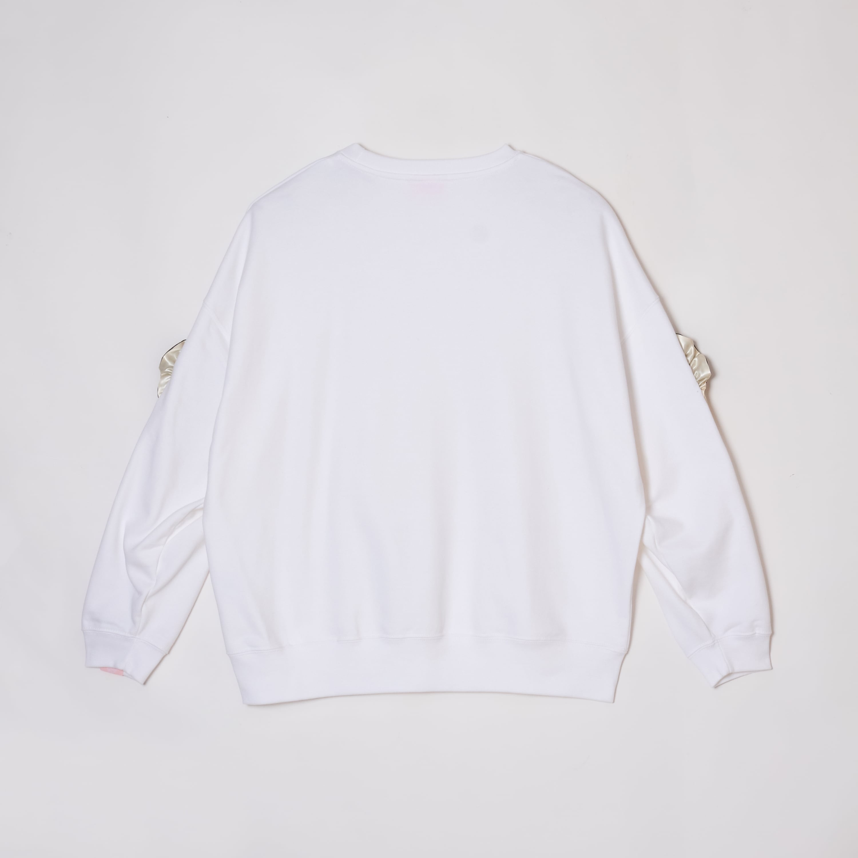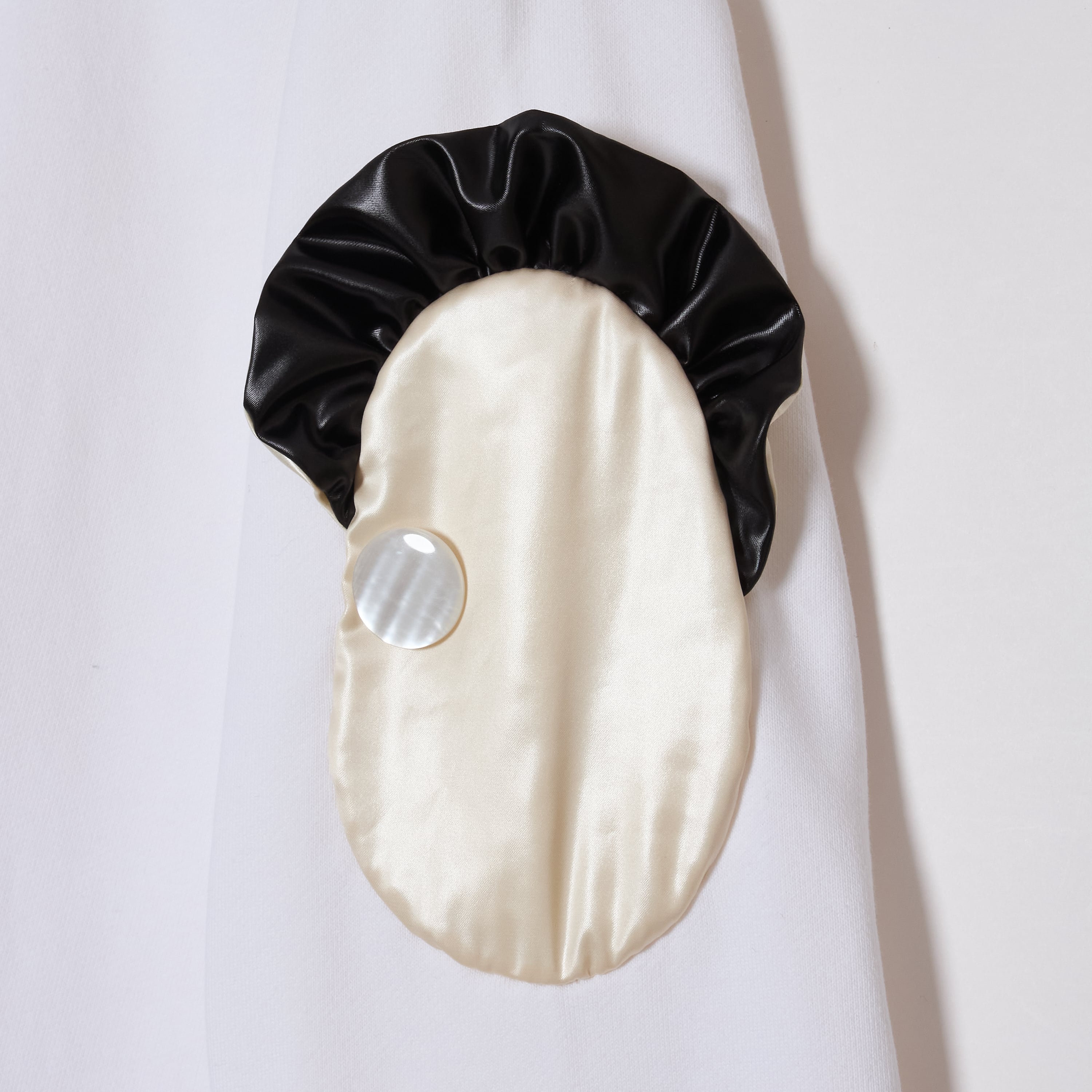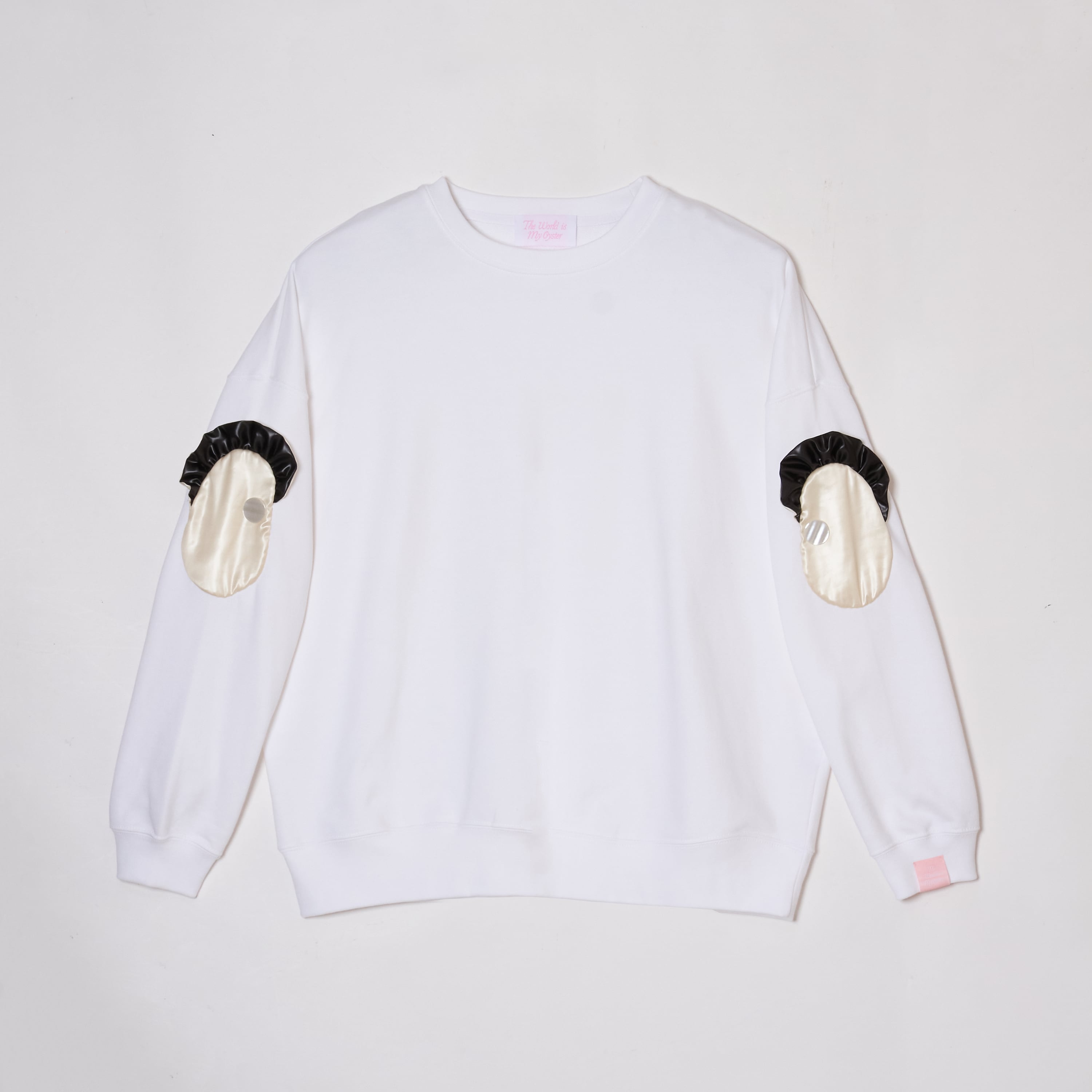 ぷっくりと身入りの良い牡蠣の剥き身を模した肘当ては、ワックスビンテージ加工を施しレザーライクな質感と艶やかな光沢感を持つ生地で仕立て、貝柱を表現した貝調ボタンをあしらいました。フリルを思わせるヒダは、スウェットとしてのアイテム全体のバランスを考慮しミニマルなレイヤーで仕上げています。