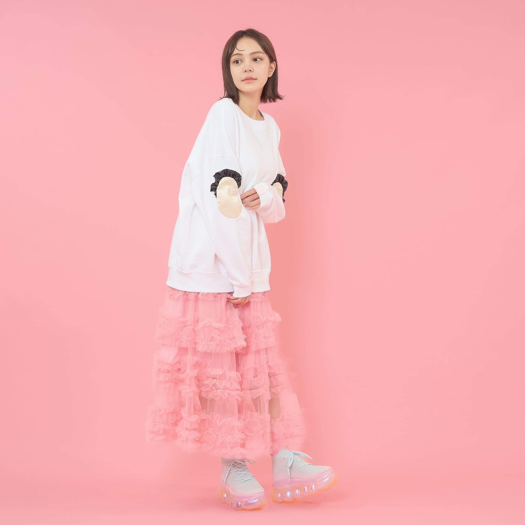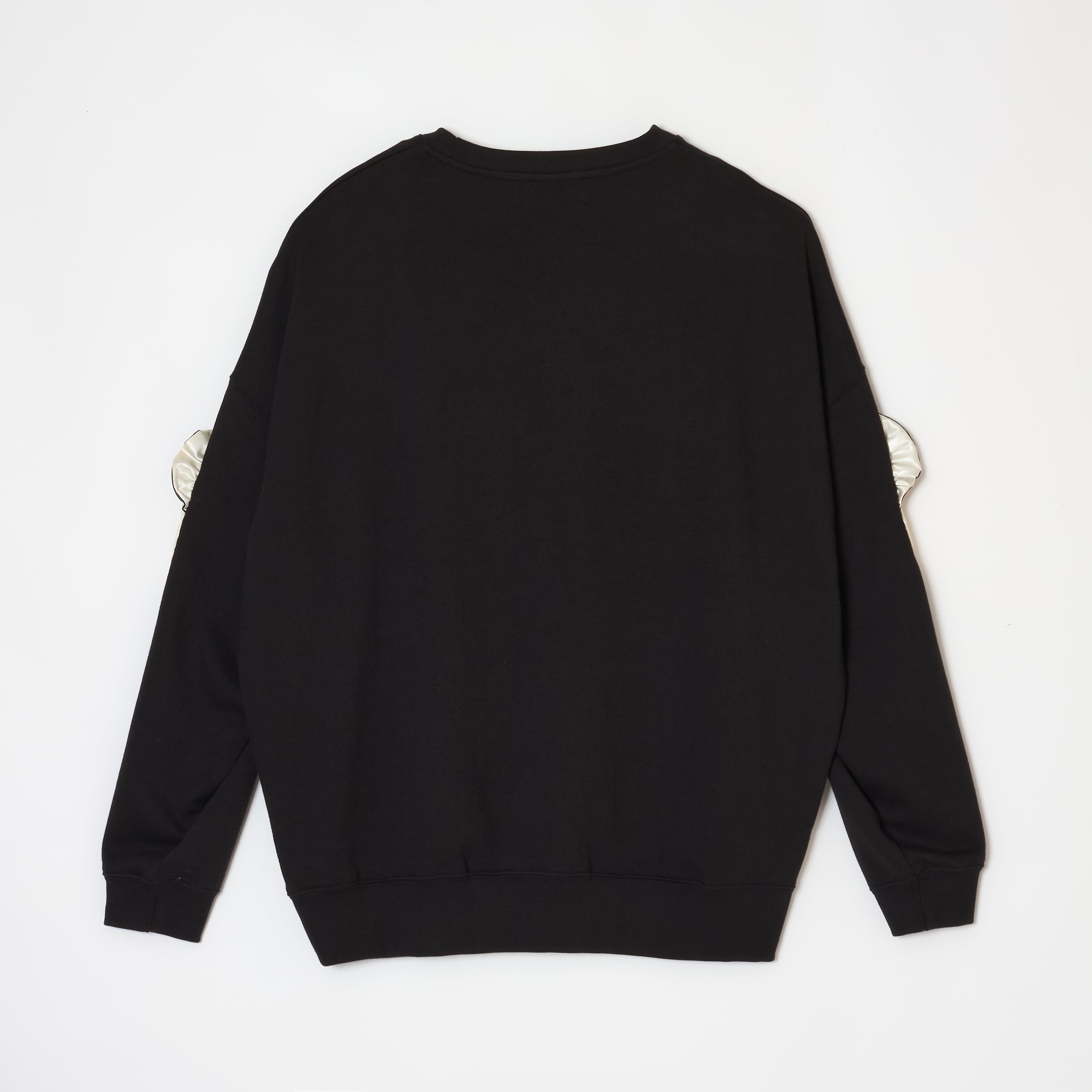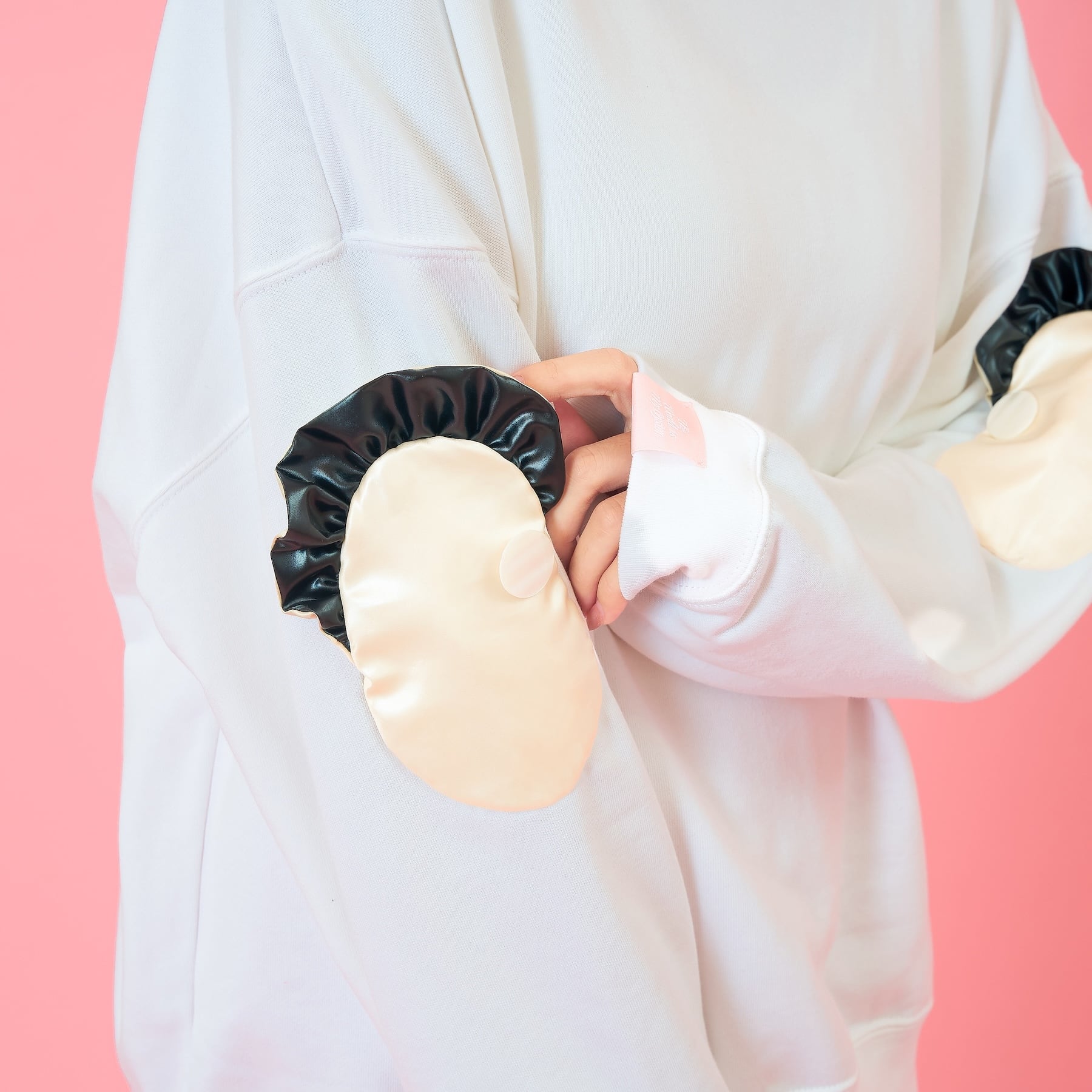 ぷっくりと身入りの良い牡蠣の剥き身を模した肘当ては、ワックスビンテージ加工を施しレザーライクな質感と艶やかな光沢感を持つ生地で仕立て、貝柱を表現した貝調ボタンをあしらいました。フリルを思わせるヒダは、スウェットとしてのアイテム全体のバランスを考慮しミニマルなレイヤーで仕上げています。